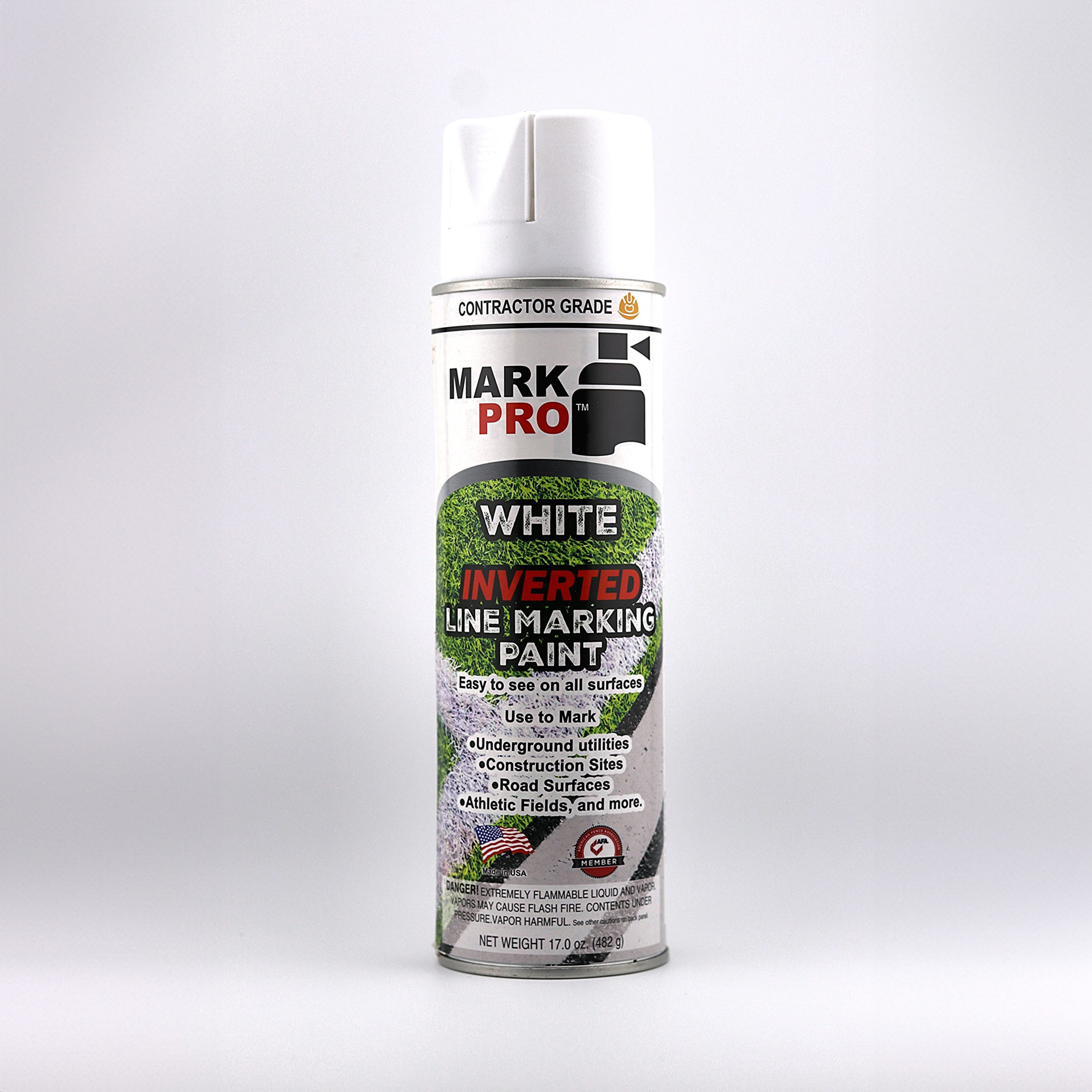 Mark Pro contractor grade inverted marking paint. Color white, easy to see on all surfaces. 12 – 17 oz cans per case.