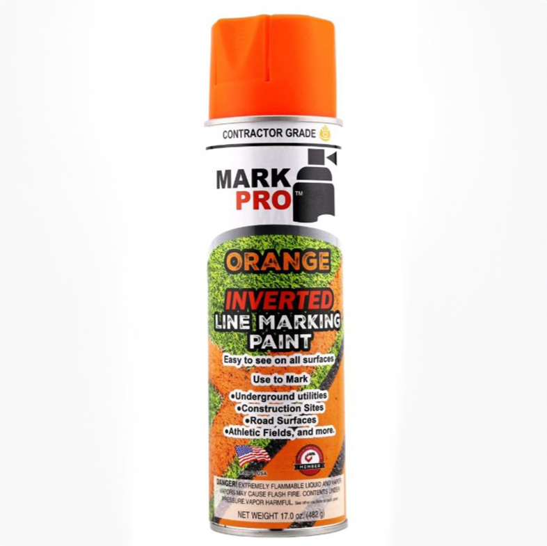 Mark Pro contractor grade inverted marking paint. Color orange, easy to see on all surfaces. 12 – 17 oz cans per case.